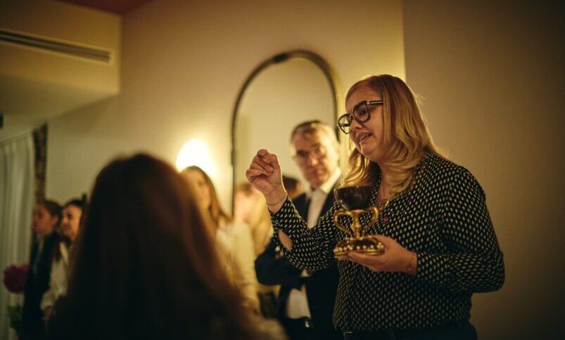 From there, the evening transformed into a sensory journey through the hotel’s various rooms. The first invited contemplation: artist Diego Zappa was working on an ephemeral piece inspired by Mediterranean light, constructed with natural elements that seemed to breathe. The next room led attendees to discover one of Valencia’s great undiscovered treasures: the Holy Grail, presented by Ana Mafé García, who recounted the story linking this relic to the city, surprising even those who thought they knew it. The final room focused on the senses: perfumer Laura Monzón spoke about the aromas that represent Valencian identity and presented the perfume created exclusively for One Shot Puerta Ruzafa, while artist Yuè SanJuan sang a lullaby under the Valencian moon, enveloping the space in a soft, luminous calm.