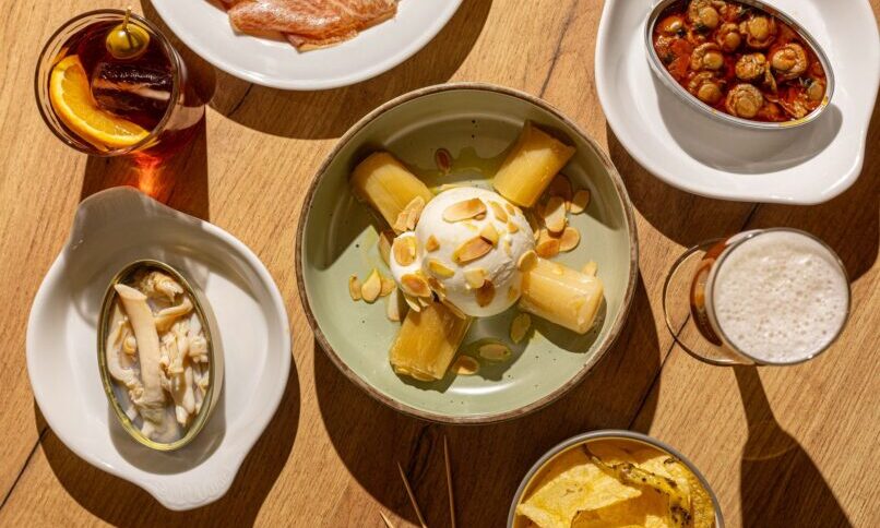 The menu combines traditional tinned goods with surprising recipes, designed to be enjoyed with friends in a relaxed atmosphere. Among the featured canned products are pickled mussels, razor clams, small chorizo sausages in Albariño wine, sardines with Padrón peppers, and canned bluefin tuna loin. Customers can also enjoy a variety of gildas (anchovy, olive, and pepper skewers) and croquettes, such as Iberian ham and corn nuts or blue cheese and walnuts. As for the tapas and the dishes to round off the experience, as they call them on the menu, there are numerous recipes that combine ingredients and are presented in a way that’s different from the usual. These range from Italian burrata with confit leek and almond, to “tabarritas”—their own version of fried pork belly with lime—or preserved artichokes with 100% acorn-fed Iberian ham and egg yolk.