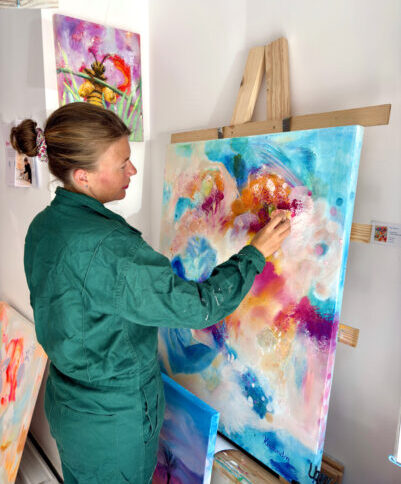 “Arriving in Valencia in 2019, I was inspired by the majestic colours that envelop our skies and I am delighted to show these pieces in the traditional neighbourhood of Cabanyal,” says Kassandra Flinterhoff of Kassandra Studio. Kassandra arrived in Valencia in 2022 from Germany and fell in love with the vitality of the city. A graduate of the Milan Art Institute’s Master’s Program, she quickly perfected her style in Valencia, where she paints on canvas in several layers using acrylics, sand, collage, gold, airbrush and traditional oils to bring to life the colours of the city that inspire her.